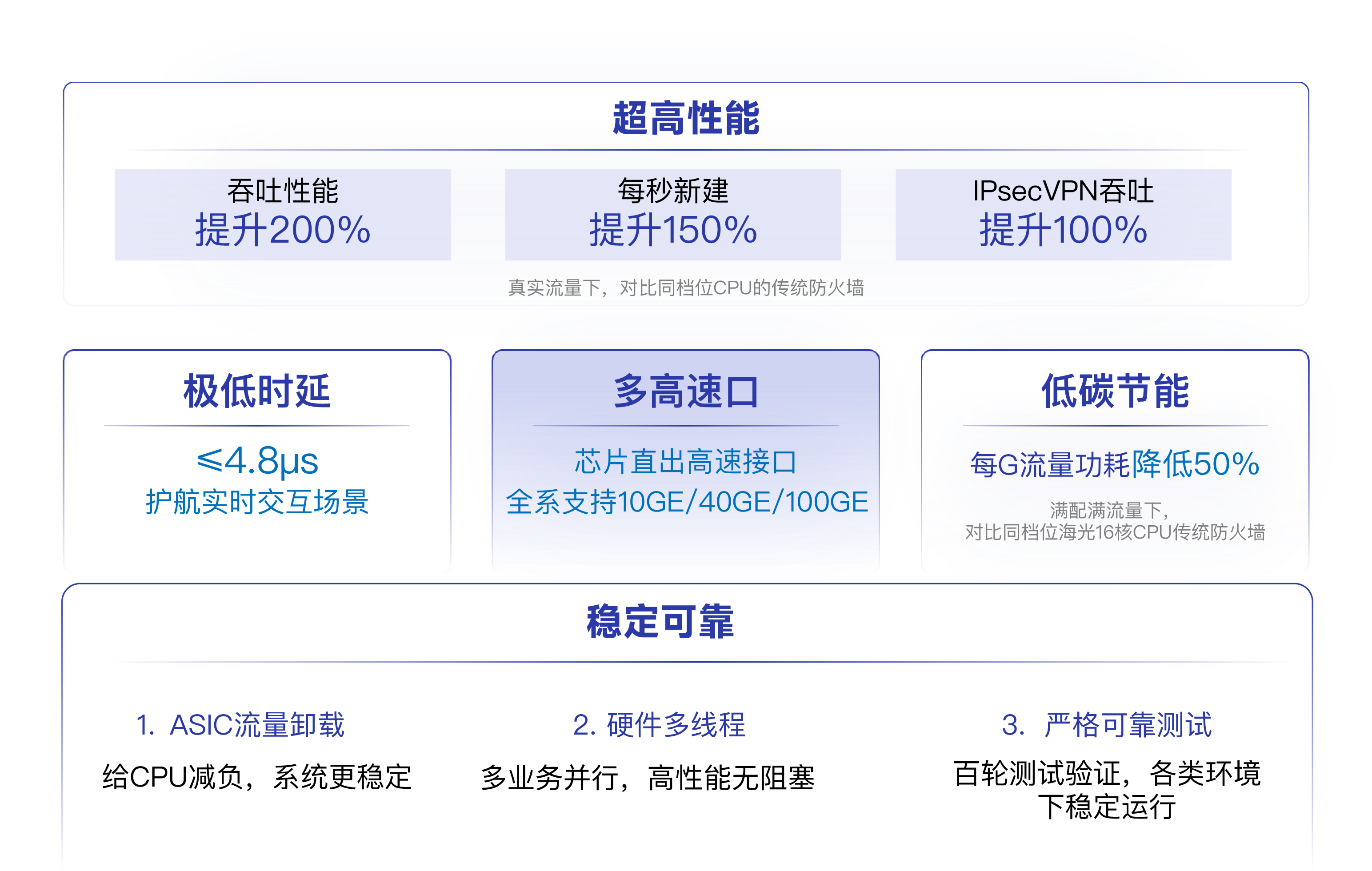产品核心特性突出,具备超高性能、超低时延、丰富高速接口、节能环保及稳定可靠等优势,可向用户提供全面立体的高级威胁防护、云网协同的纵深防御体系及业务可视的自动化运维能力,为政府、金融、能源、企业、教育等行业用户的安全运营提供坚实保障。