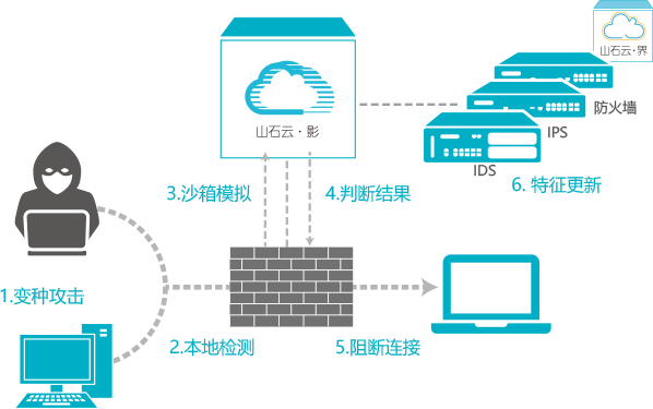 基于云端架构的恶意软件分析环境,包括海量恶意样本库和高性能沙箱集群。山石云·影和享有盛誉的彩神购Vll购防火墙、IPS等安全产品无缝连接,将特征匹配无法判别的文件传送至云端进行行为分析,平均两分钟,最快1分钟检测出未知威胁;同时,山石云·影基于全局威胁情报共享,将一个接入点检测到的未知威胁情报信息共享到所有站点,将未知威胁变已知威胁,快速阻断。
