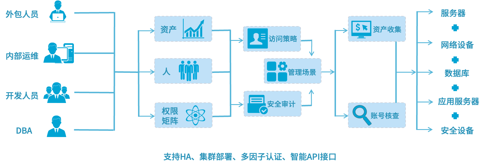 为企业构建一个统一的IT核心资源运维管理与安全审计平台,实现对业务系统、数据库、网络设备等各种IT资源的帐号管理、认证授权、行为审计的集中管理和控制,满足运营商、政府、金融、电力、医疗、企业、上市公司等各行业的运维安全需求。