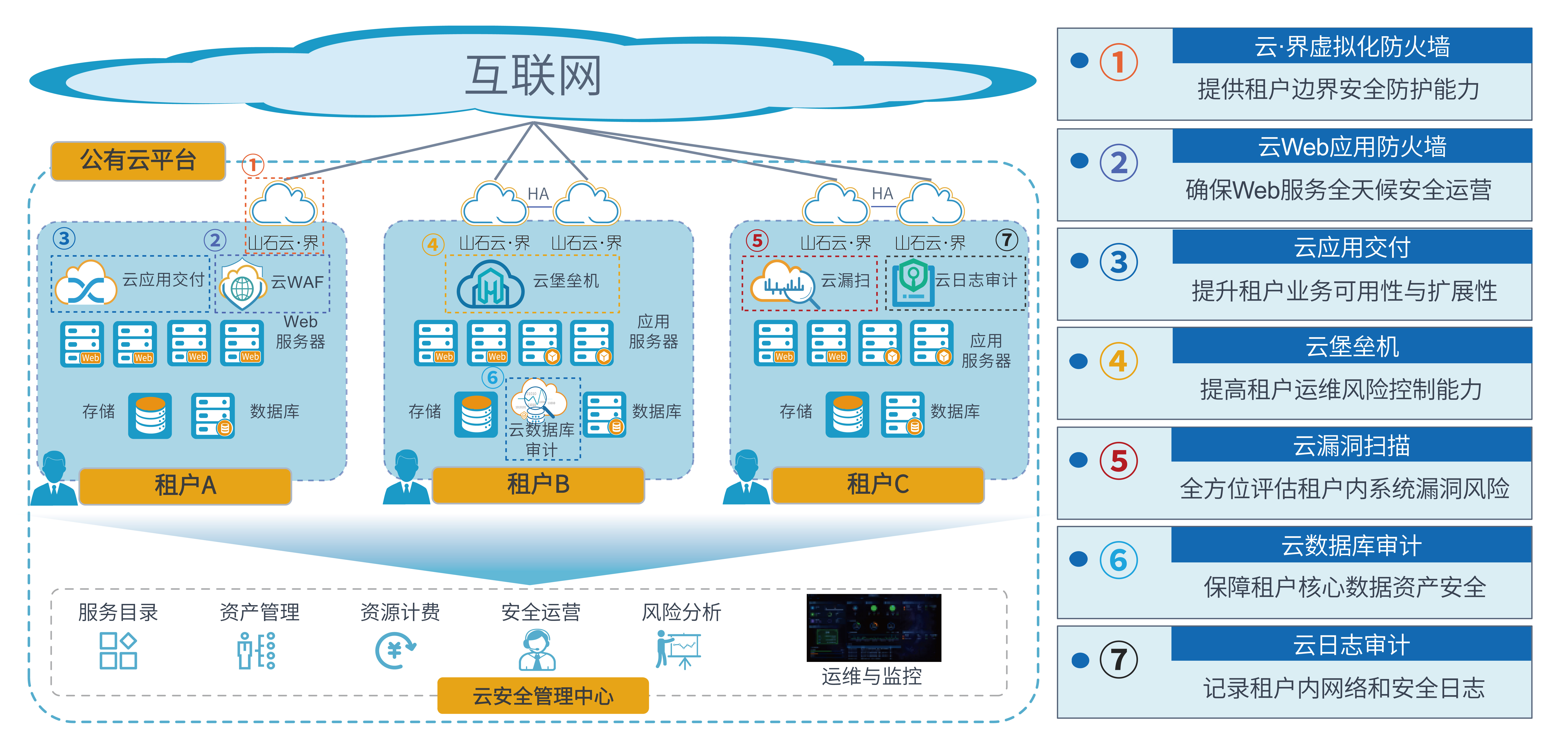 方案从租户的边界安全、应用安全、数据安全等方面多层次、全方位地进行安全防护体系建设,全面守护租户公有云内的业务。