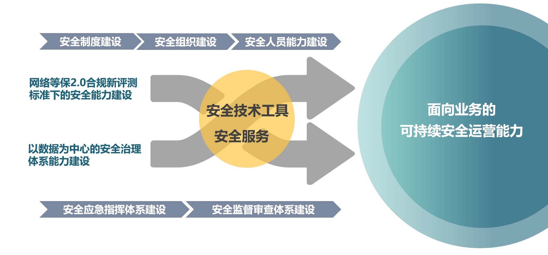 其中通过制度规范体系建设,指引企业在技术防护体系中的构建方向,也指引着运营管理体系中的组织建设和人员能力建设的方向;同时,运营管理体系的建立也确保了制度规范体系的落地执行,和技术防护体系发挥实际作用;而技术防护体系作为关键工具,为制度规范体系和运营管理体系提供了实际的工具抓手。