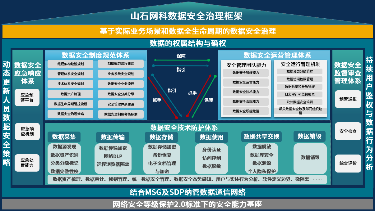 山石提出了以“制度规范体系”“技术防护体系”“运营管理体系”为核心,“监督审计体系”“应急响应体系”为支撑的数据安全治理五大体系架构。并通过引入零信任理念,进一步的对数据安全的防护能力进行了提升。