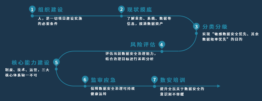 因此,相对于传统网络安全规划建设,数据安全治理对“科学性”、“系统性”提出更高要求。基于这一现状,彩神购Vll购发布了以数据为中心的数据治理体系,并通过组织建设、现状摸底、数据分类分级、风险评估、数据安全核心体系建设、数据安全支撑体系建设、持续面向全员的培训等七个步骤(如下图)有序、科学地完成企业数据安全治理建设工作。