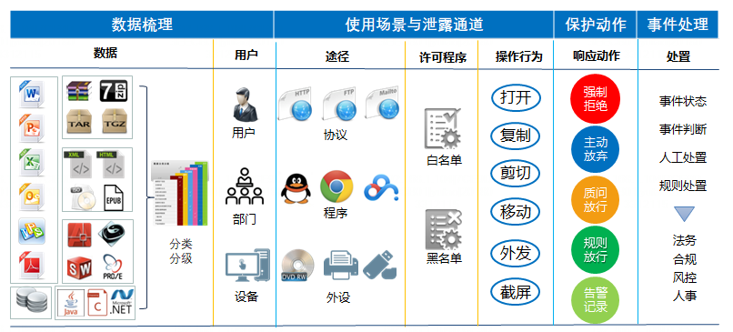 数据防泄漏能力:以深度内容识别技术为核心,在数据存储、传输和使用过程中,发现并监控敏感数据,确保敏感数据的合规使用。