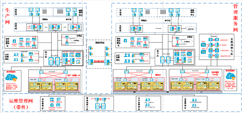 生产网:云池、防火墙、日志审计、堡垒机、主机安全、态势感知、数据库审计、漏洞扫描、容器安全、Web应用防火墙、网页防篡改、应用负载均衡、网闸。