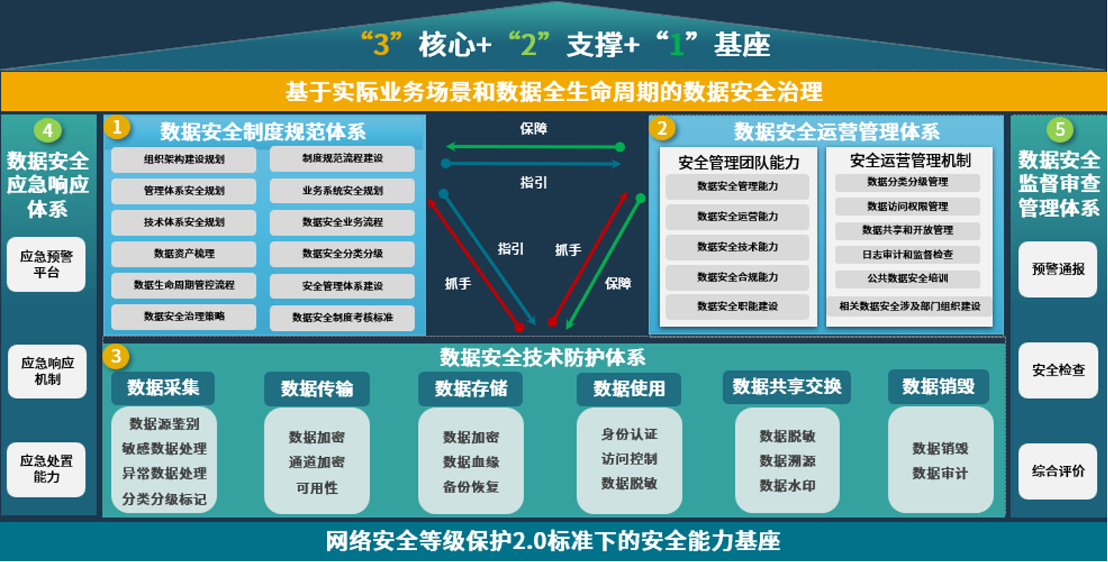 山石提出了以“制度规范体系”“技术防护体系”“运营管理体系”为核心,“监督审计体系”“应急响应体系”为支撑的数据安全治理五大体系架构。