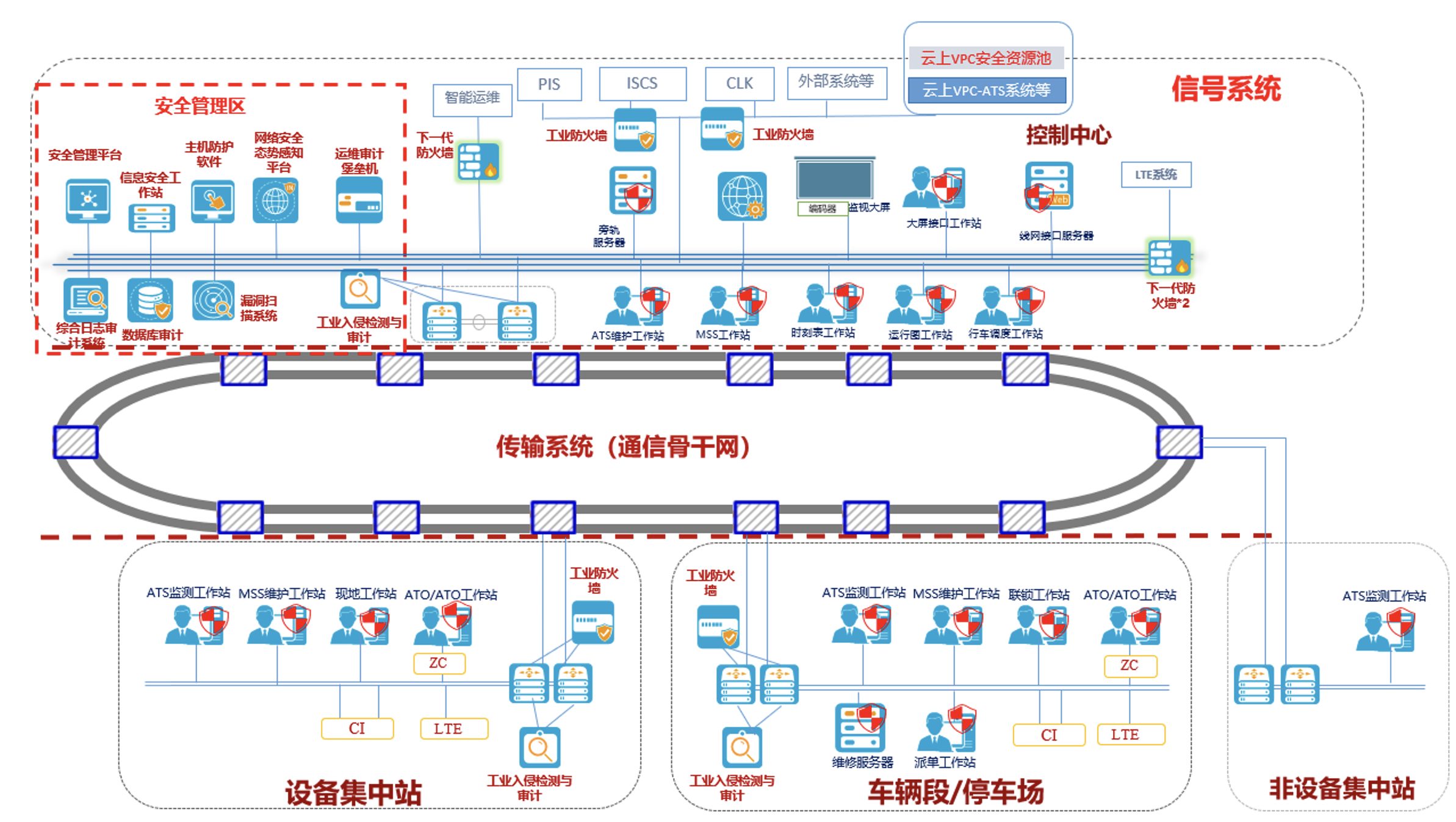 在设备集中站、停车场以及车辆段分别部署工控防火墙和工控安全监测与审计系统,参考等级保护安全防护框架,遵循合规性、适度安全原则、分区分域建设原则、多重保护原则和最小影响原则等基本原则。仅允许正常业务数据穿过,有效抑制病毒、木马在工控网络中的传播和扩散,实现外部系统的边界隔离和已知的网络威胁防护。