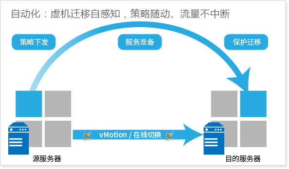 当虚机迁移,山石云·格自动感知,安全防护随虚机而动,虚机网络会话不中断。