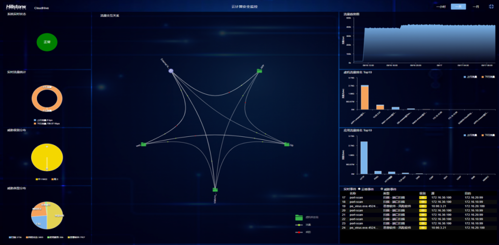 山石云·格的大屏展示功能直观呈现云内实时业务状态、流量统计、流量趋、威胁分布、威胁类型、应用流量统计、威胁事件等信息。