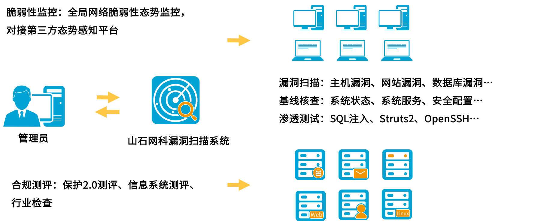 安全漏洞、高风险服务、弱口令、网马暗链、远控后门等网络脆弱性扫描定位,高危流行漏洞针对性渗透测试;
