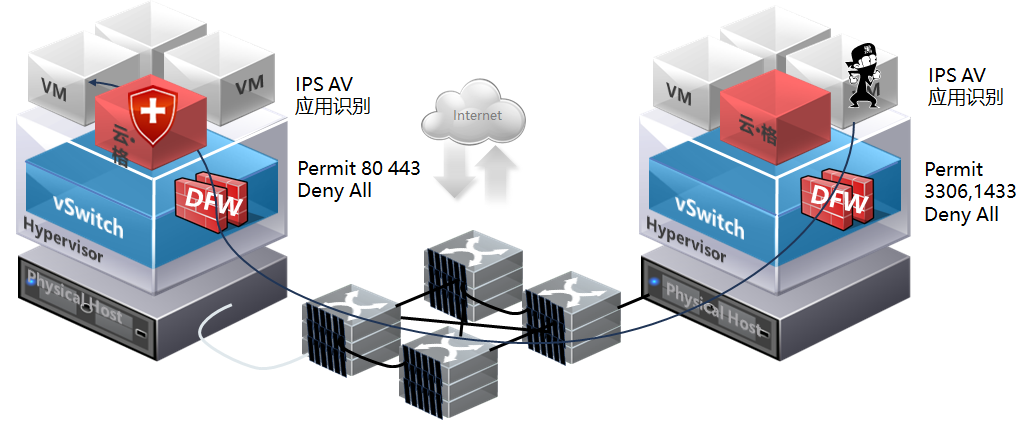云计算和虚拟化技术出现后,在云内呈现了多样的安全挑战。云计算环境内部,由于缺乏适应云计算需求的安全产品,在安全方面普遍呈现了以下问题:
