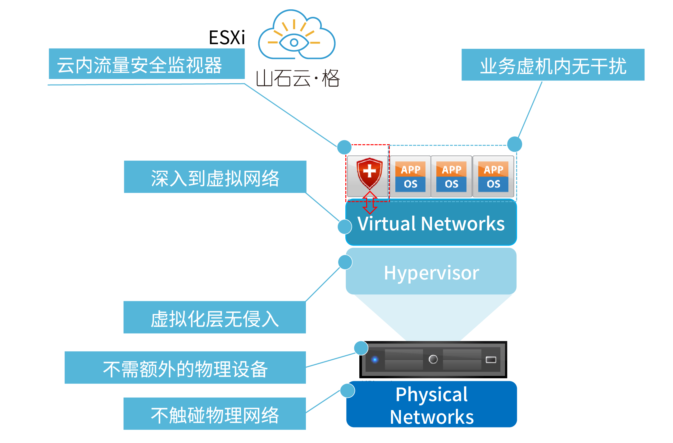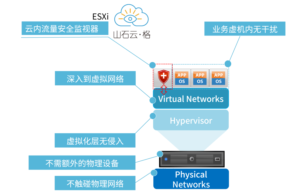山石云·格是以虚机形态存在的网络探针深入云内,贴近虚机;对虚拟网络流量可视化监控工具,具备应用识别、异常行为识别、网络病毒识别能力。
