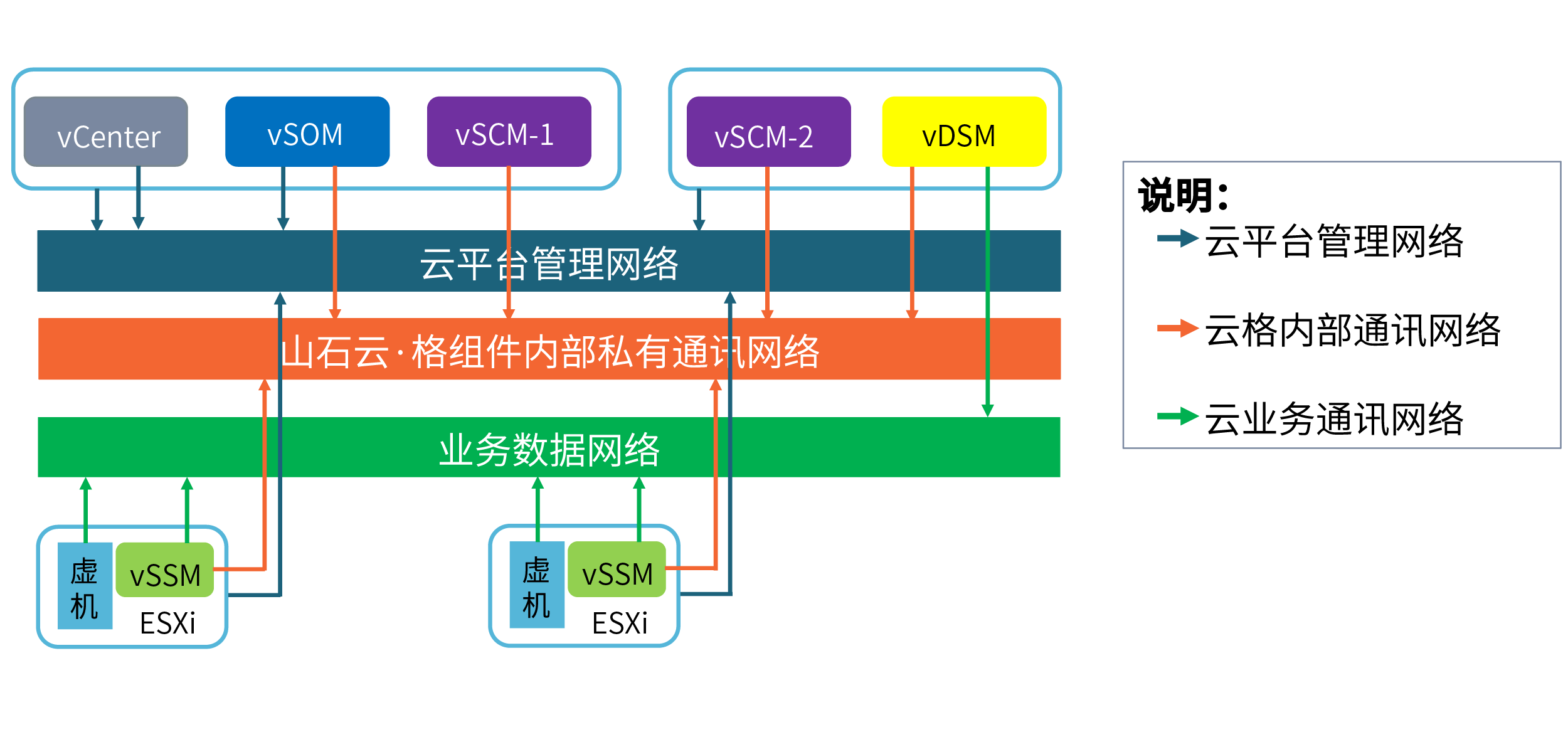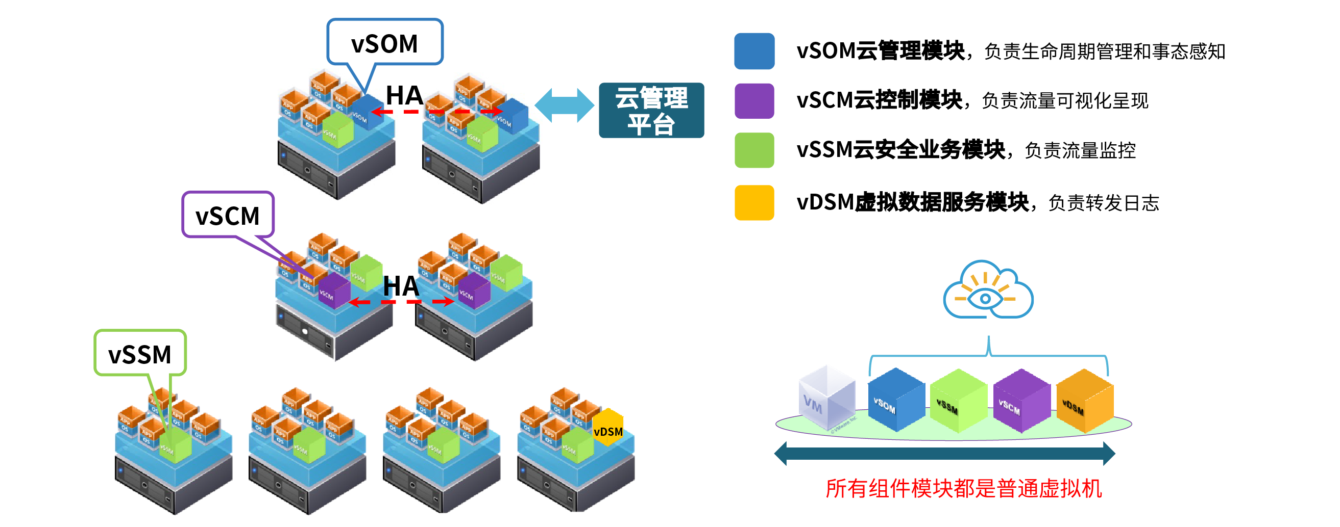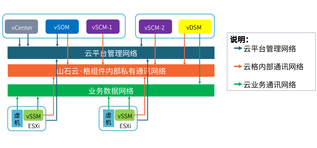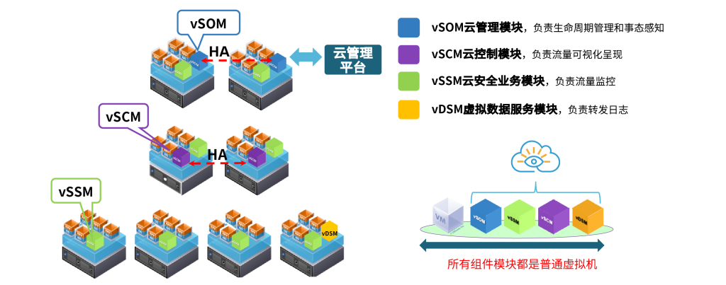 由vSOM、vSCM、vSSM、vSDM四大虚拟模块组成,这些虚拟模块均以虚机的形式提供,基于云平台的模板分发机制,山石云·格可实现快速、高效部署。同时,山石云·格基于透明二层模式,用户无需更改虚机当前网络配置,即可实现山石云·格产品部署,不影响当前业务运行。山石云·格采用全分布式架构,多个模块只通过一个IP地址管理,全局维护统一策略和会话表,可实现原址在线升级。
