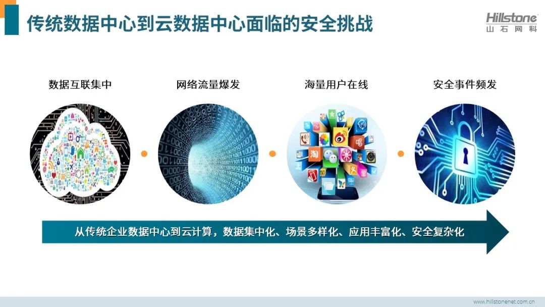 云计算推动了虚拟化技术的更快迭代和广泛使用,规模化的硬件基础设施之上是数以十倍甚至百倍的虚拟化资源。由此带来的平台安全、资源隔离、数据安全等问题,对安全技术及产品、方案在云数据中心的适配提出了更具难度的要求。例如:云计算平台自身的安全管理,物理/虚拟资源的安全隔离和访问控制,虚拟化安全资源动态扩缩容管理等,云环境安全合规等等。