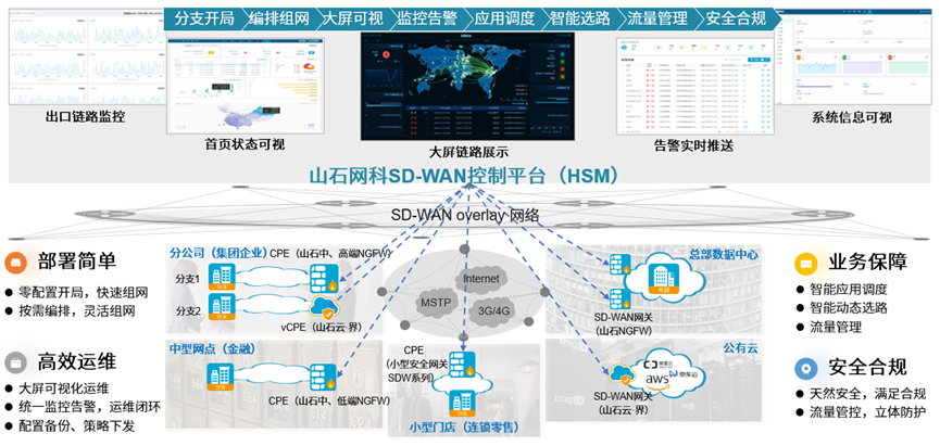方案整体采用HSM(安全管理平台)作为SD-WAN控制器,对所有分支区域的出口网关设备CPE进行统一管理及配置下发。其Underlay网络采用互联网、专线、4G 等多种链路,链路选择灵活;Overlay 网络通过SD-WAN控制器进行可视化的配置与隧道建立,实现企业总部、分支机构、与云环境之间的高效互联通信。