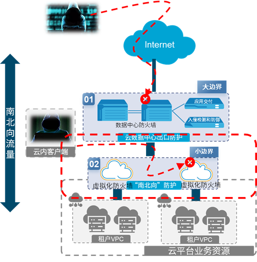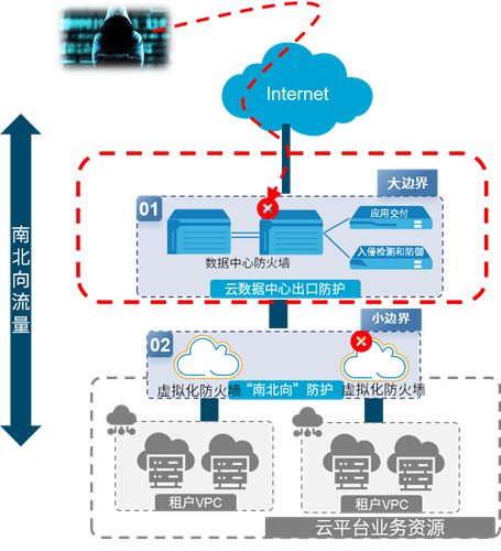云数据中心大边界安全防护的建设是关注重点,需要同时考虑安全通信网络的要求和安全区域边界的要求,保障整个云平台的正常运转,同时提升防御来自互联网的各类攻击和入侵行为的能力,是保障整个云平台系统安全的关键。