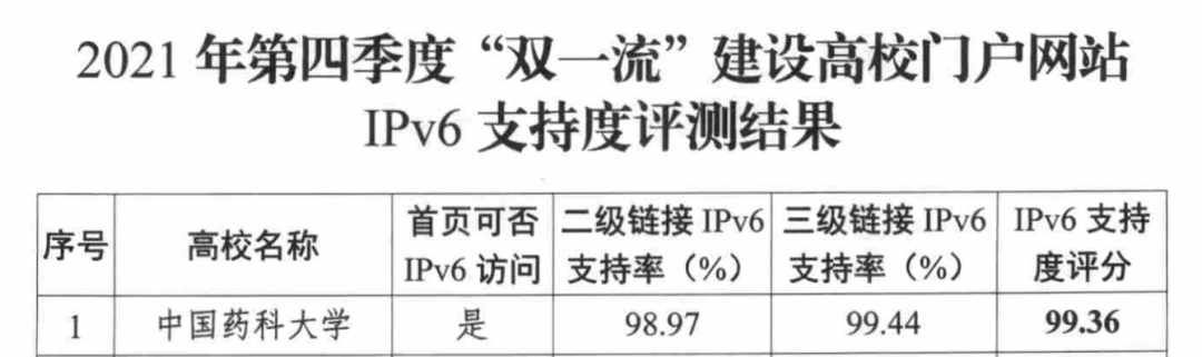 教育部科学技术与信息化司发布《关于“双一流”建设高校门户网站IPv6支持度评测情况的通报》,采用彩神购Vll购高校数据中心IPv6升级改造方案(相关产品:彩神购Vll购应用交付AX系列)的中国药科大学在2021年第四季度“双一流”建设高校门户网站IPv6支持度评测结果中IPv6支持度评分99.36,排名第一。